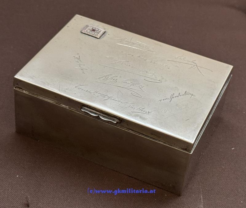 k.u.k. Zigarrendose - Offizielle Kriegsfürsorge - Unterschriften: Kaiser Franz Joseph I., Erzherzog Eugen, Erzherzog Carl usw.! - Alpacca gestempelt - Format: 13,8 x 10 x 5,2cm - mit Abzeichen Offizielle Kriegsfürsorge und 'Viribus Unitis' Schriftzug - und mit den Unterschriften von: Kaiser Franz Josef I. - Erzherzog Friedrich FM - Erzherzog Eugen Ge - Erzherzog Carl Genlt. - Conrad von Hötzendorf Gen. Oberst - Mackensen GFM - von Hindenburg GFM - seltene Zigarrendose der offiz. Kriegsfürsorge mit tollen Unterschriften im gutem Zustand!