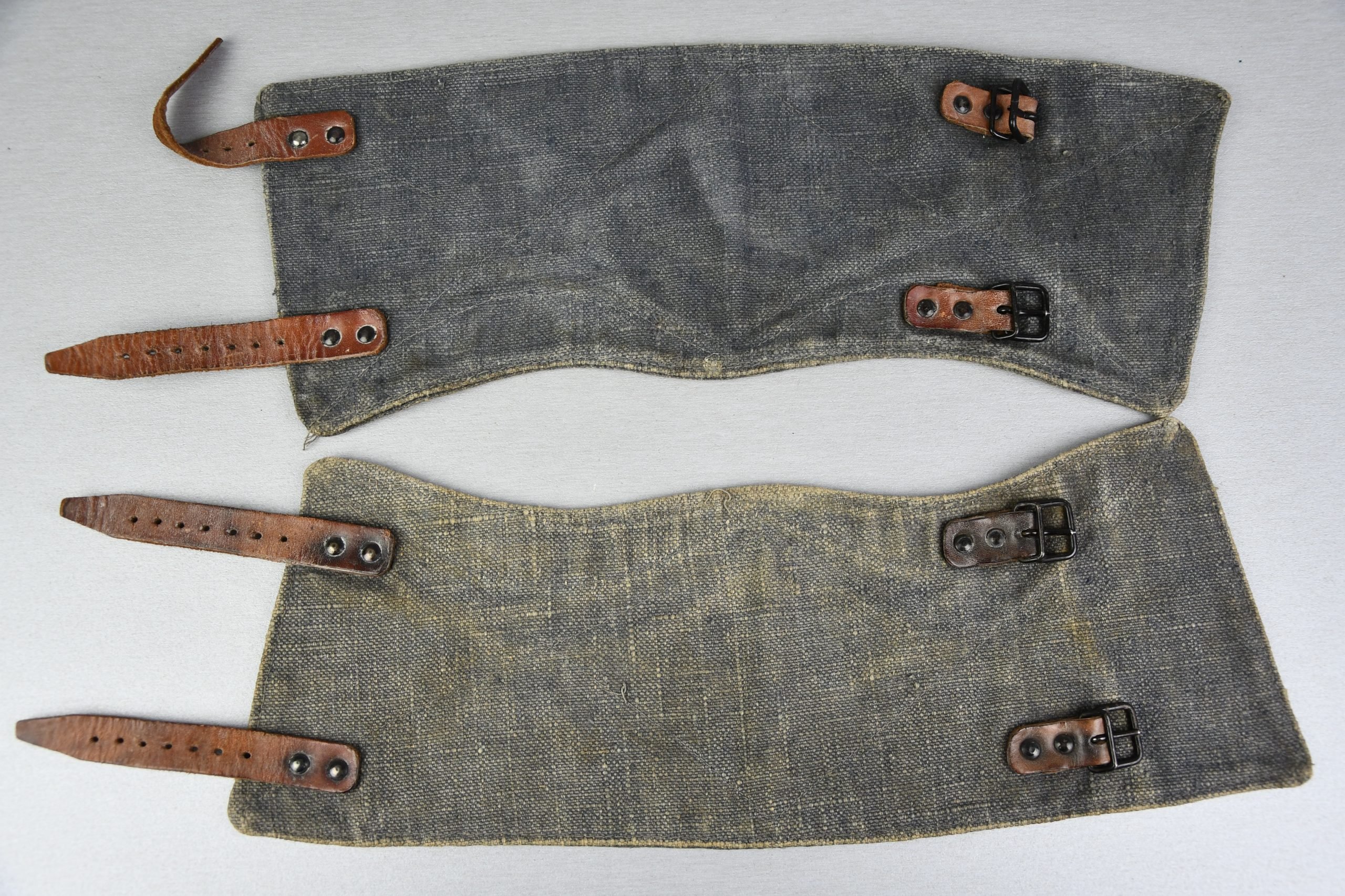 Pair of Wehrmacht (or SS) Gamaschen (gaiters) in good condition. Light blue colored canvas construction with brown leather straps and steel buckles. Shows stamps from the famous Statni Film Studio's who had a lot of origial equipment in their stocks.