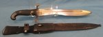 Original era manufacture. A well made Spanish Artillery Bolo with a 12 inch polished steel blade, blue steel finished guard and pommel, with checkered wood grips and a spring steel scabbard lock on the top of the grip. Black leather bodied scabbard with a blue finished steel throat and chape. At some point in time a WWII German S84/98 bayonet frog was fitted to the scabbard. Used by both sides during the Spanish Civil War.