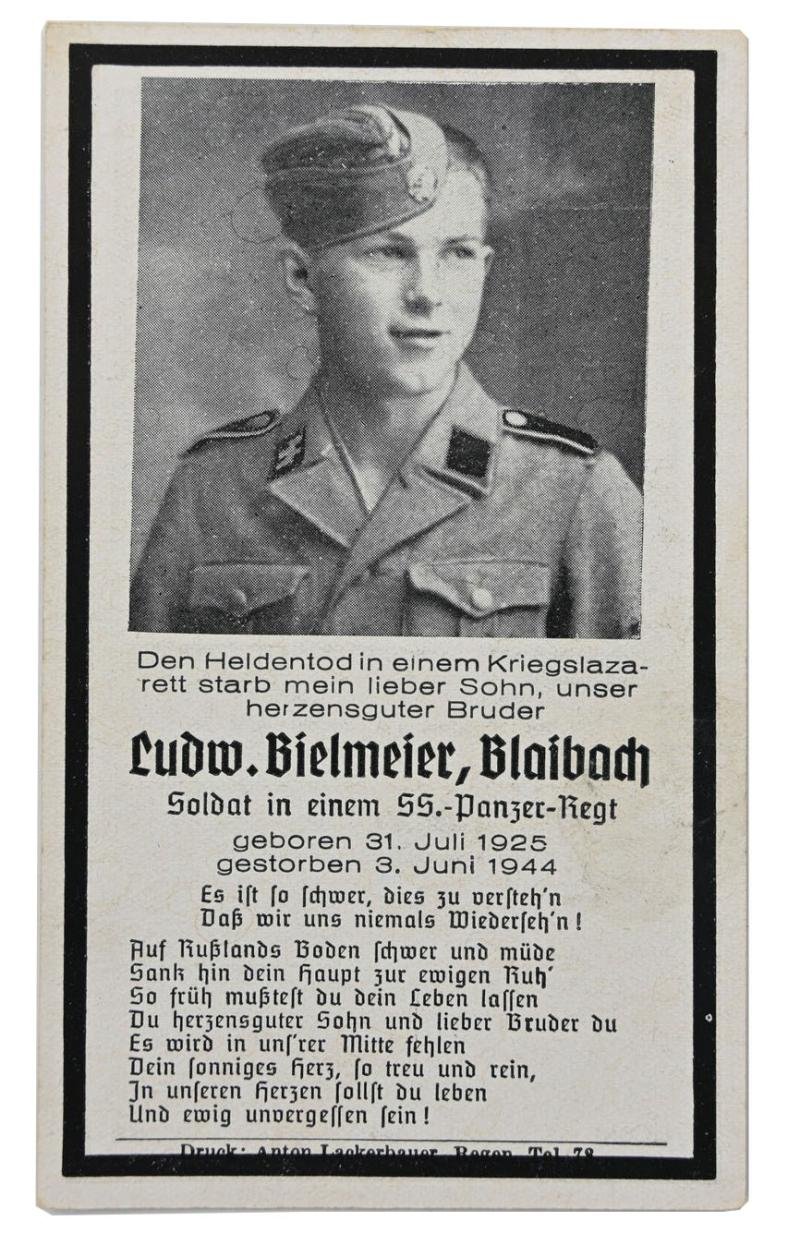 In a very good condition a German Waffen-SS Panzer Regiment Death Card.The death card is on the name of Luwig Bielmeier and was a member of SS Panzer regiment and was killed in action on 3 june 1944 in russia.