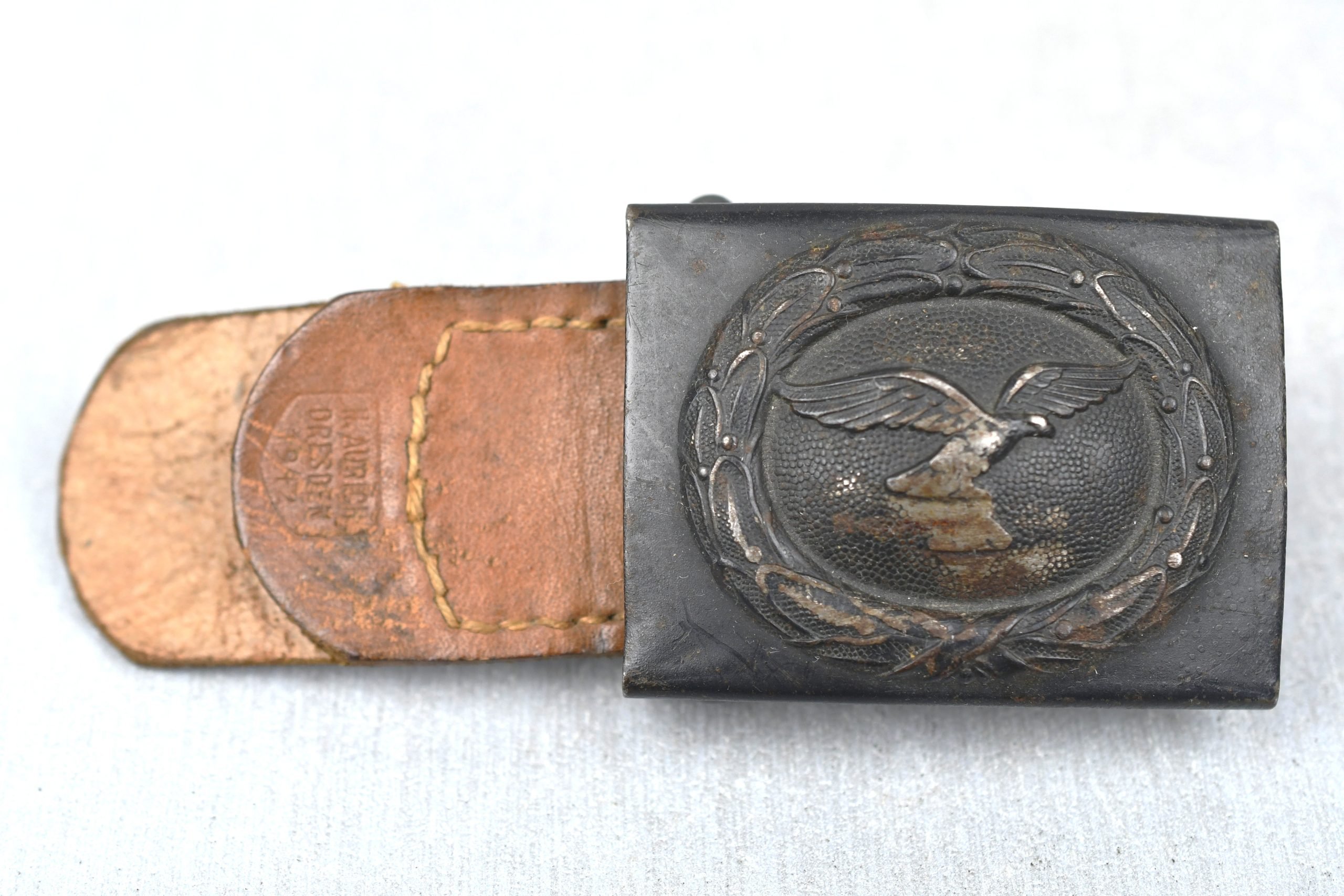 Luftwaffe belt buckle executed in steel. Retaining most of its genuine blue finish. Maker marked on the leather tab by Hermann Aurich, Dresden, dated 1942. The reverse of the steel buckle is also marked with the factory logo of H. Aurich. Denazified example.