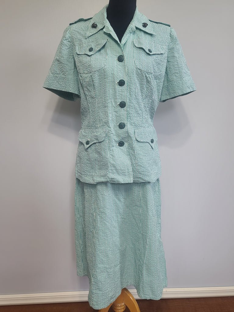 Original WWII USMCWR Marine Corps Women's Reserve summer seersucker uniform, jacket and skirt.MEASUREMENTS (approximate):JACKET:Bust- 41'Waist- 34'Length-25 1/2'SKIRT:Waist- 30'Hips- 40'Length- 29'The collar has screwback USMC EGA insignia. The buttons are held on with safety pins. Overall good condition. The skirt looks like its been taken down and the hem is a little wavy.