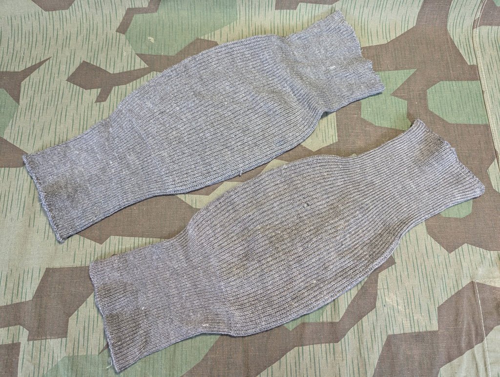 Original machine knit gray wool knee warmers. One of the lesser known winter accessories that were fairly common in the Wehrmacht. In good condition with a few tiny holes and some minor staining from years of storage.