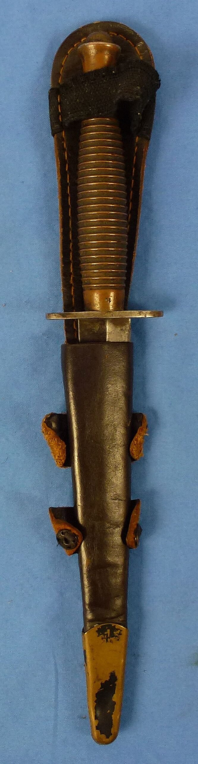 The blade of the knife is dark, showing spots and mottling, but without nicks, chips or active rust. The ferrule area of the grip bears what appears to be the inspection mark of a number '10'. The surface of the guard bears several letter markings. The ribbed grip exhibits a dark and uncleaned patina. The brass fitting at the base of the leather sheath has lost most of its matte black finish. The sheath has wear and age, but it is complete and intact. Overall very good field used condition.