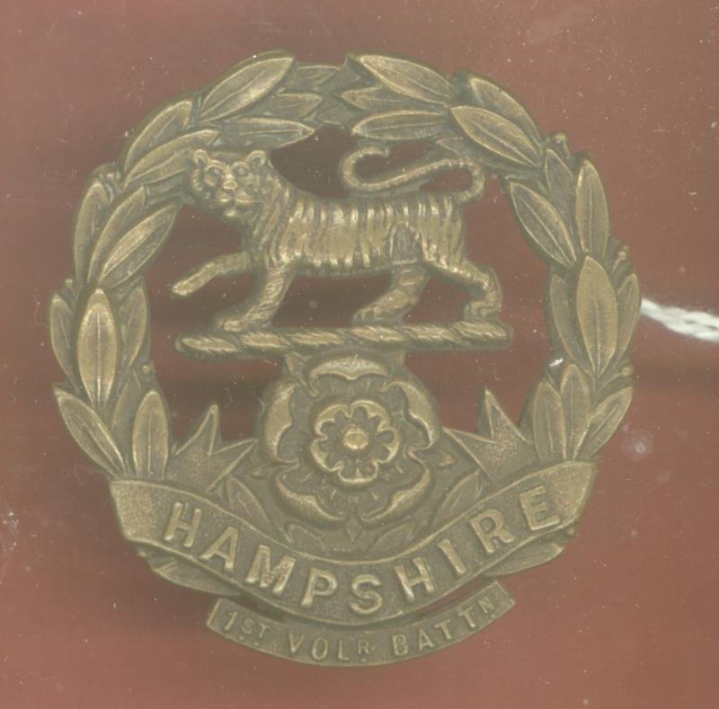 A good scarce die-stamped bronze Tiger on Rose resting in laurel sprays bearing HAMPSHIRE with curved tablet below 1ST VOLR. BATTN. Two loops to the reverse. VGC1st Hampshire RV became a VB of the regiment on Friday 1st July 1881, redesignated 1st VB on 18th August 1885. HQ at Winchester. Many of it's members served in the Boer War resulting in the Battalion being awarded the honour 'South Africa 1900-02' in 1905. Became 4th Battalion in 1908.