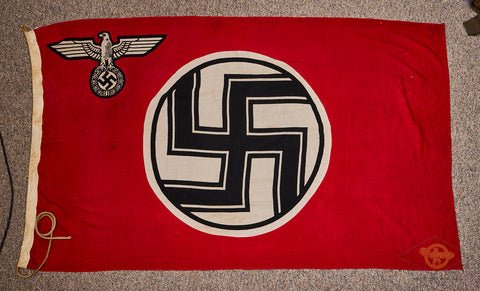 German WWII State Service Flag - This is produced in red bunting material that is vibrant in color. There are many small holes as well as a one inch tear along with a few small stains. There is printed insignia which produced a mirror image on the reverse. Each corner of the hoist end is reinforced with additional material. The fly end is reinforced with additional stitching. The hoist end has a white heavy cloth reinforcement sewn over a rope lanyard which is loose at one end and looped at the other. It is marked Reichsdflg 1.5 x 2.5. It measures 94' long X 56' high (239cm x 142cm). Overall good condition and not too large of a flag.