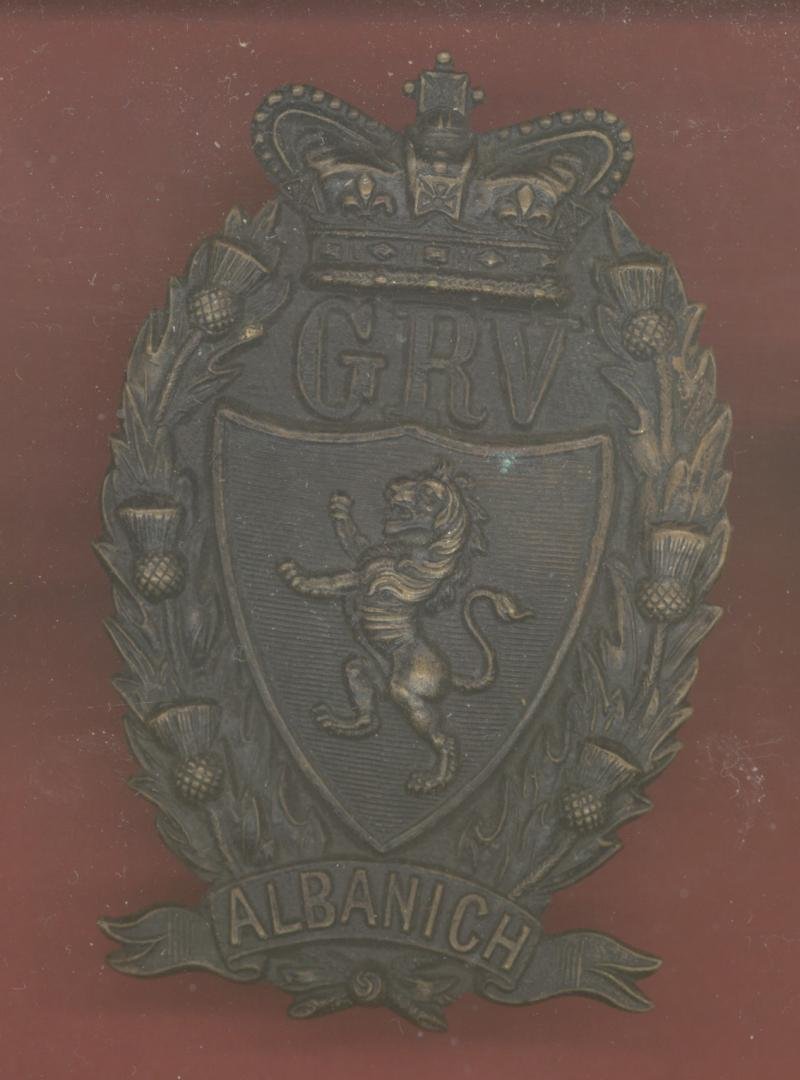 A fine scarce die stamped blackened brass example.A shield bearing the Scottish Lion above the motto, ' Albanich ' within a wreath of thistle surmounted by the letters, ' GRV ' and the crown. Two toned loops to the reverse. VGC. Bloomers bk2 page 33