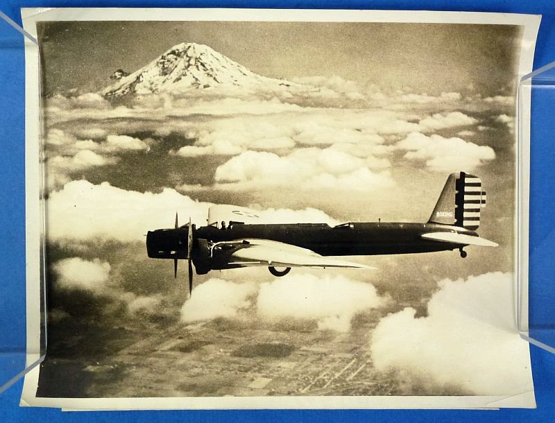 Approximately 8 inches by 10 inches. The photograph shows some curling from age. A typed caption is affixed to the reverse side. The Boeing YB-9 was the first all-metal monoplane bomber aircraft designed for the United States Army Air Corps. The YB-9 was a much enlarged twin-engine development of Boeing's single-engine Model 200 Monomail commercial transport. Only small numbers were built as prototypes, but these entered service starting in September 1932 and were used until early 1935.