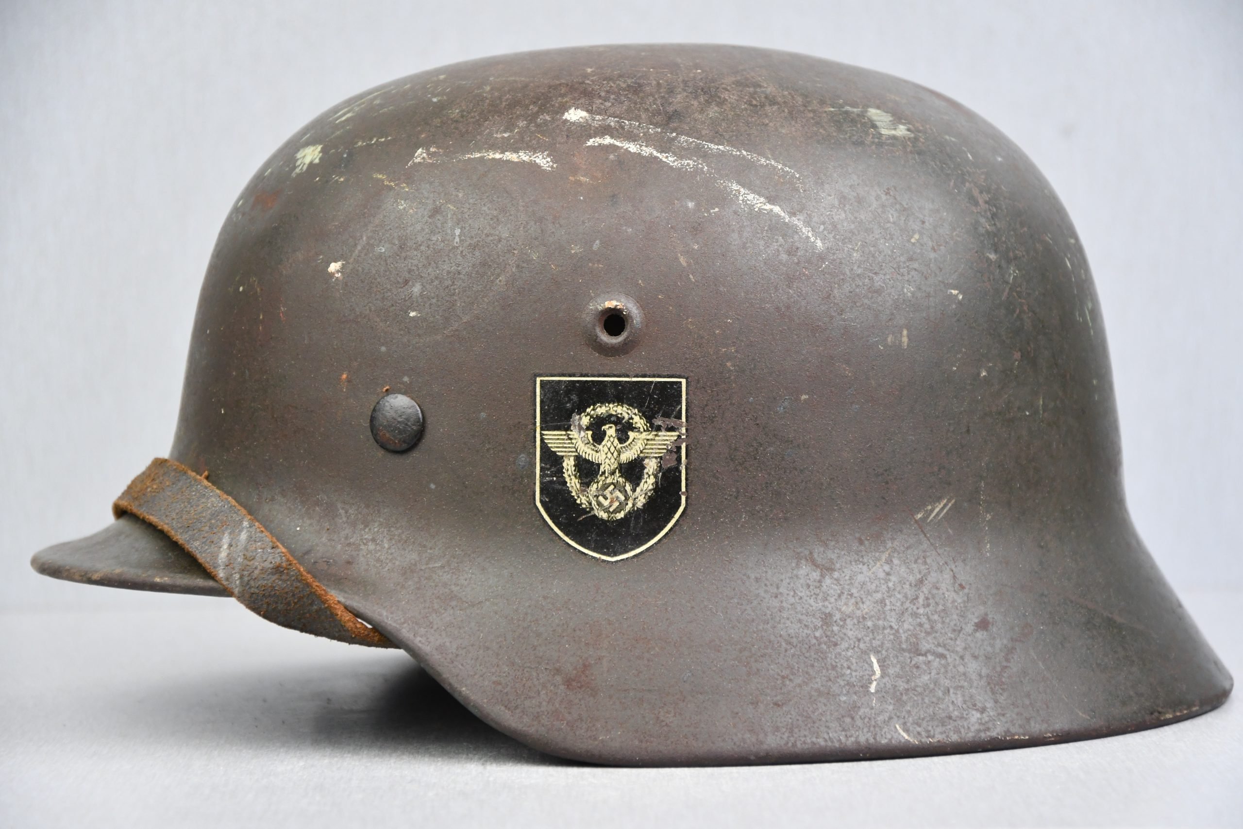 Worn M40 pattern Police helmet in good condition. Both decals remain present for over 90% on both sides of the helmet. Swastika shield shows scratches. The top of the helmet shows a hole from demilitarisation. The liner is a genuine example, 1941 dated on the side. The condition of the leather is very good and it is complete with its genuine draw string and full length early chin strap with aluminum buckle. The liner has been out at one point in time, as the washers from the split pins are missing. The helmet is maker marked by SE, size 64. Lotnumber in the rear: 3084.. Still a good looking helmet with a few remarks, priced accordingly.