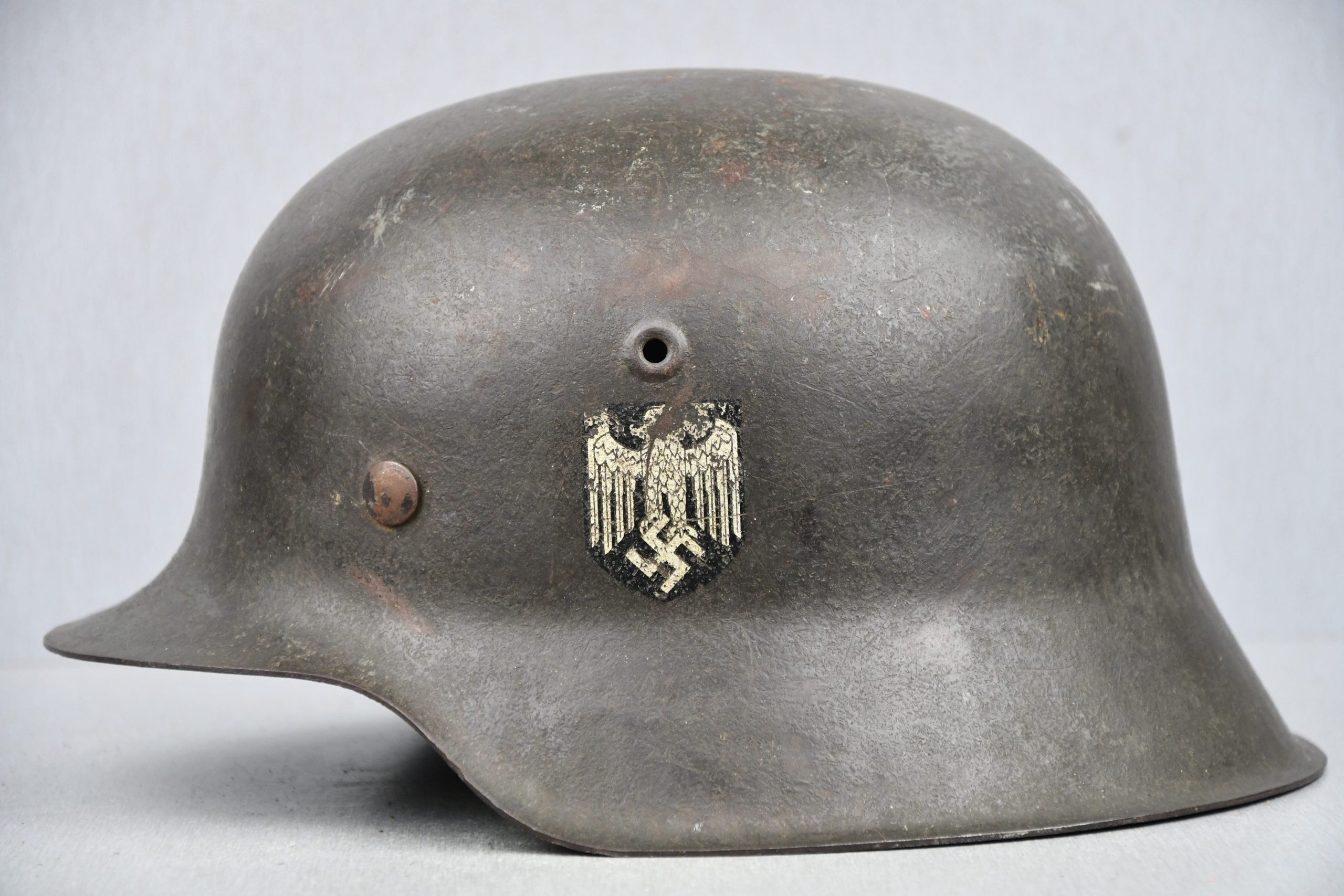 Very nice light worn M42 army steel helmet. Single decal example with a classic ET-style eagle that matches the maker of this helmet. The correct ET-pattern decal rates over 90% and retains nice details. The helmet is complete with its liner. The split pins remain untouched and show nice oxidation. Maker marked on the side by ET, size 62. Lot number 2430 (I deem!). Honest army steel helmet, a must have for any WW2 collection!