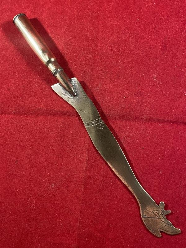 Here on offer is an unusual British WW1 bullet trench art letter opener in the shape of a lady's leg with a shoe and leg garter.The brass blade of the letter opener has been cut out in the shape of a lady's leg. It has then been hand engraved with the image of a lady's shoe and a leg garter on both sides.The blade that fits securely to an inert British .303 type bullet head and inert cartridge, with markings on the base that date it to 1917.The letter opener measures 7.5' (19cm) long with a 5.1' (13cm) blade and weighs 30g.Please see my pictures for the details of the condition, which complement this description.Please see my TERMS OF BUSINESS regarding Deliver Charges and Insurance regarding additional insurance cover, should you require it, BEFORE the item is dispatched.The responsibility lies with the customer to check with your Customs restrictions that this item can be imported into your country.Thanks for taking the time to look.