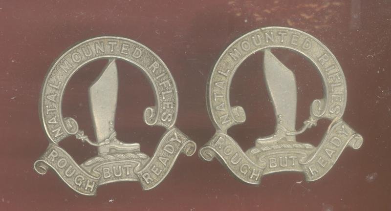 A fine scarce die stamped white metal facing pair worn circa 1914 .An spurred boot to the centre of a horse shoe scroll bearing the title,Natal Mounted Rifles, tri-part scroll below inscribed 'Rough But Ready'. Two loops to the reverse. VGC. Owen 470/472
