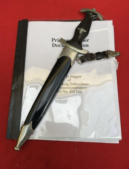 A stunning SS RZM dagger with research to DR . Ludwig Oeltzschner SS No 114542. Stunning condition blade, no nicks or rust, period painted dent free scabbard, grip has nice fit to cross guards, minor chip which can be fixed. Comes with 1 piece hanger.Age restricted item