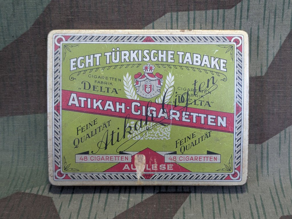 Original metal tin for Atikah Echt Türkische Tabake for 48 cigarettes. It has a slightly bowed shape to fit in a pocket more easily, like a flask. It is in overall good condition with only minor wear and scratches.Advertisement is from the Zweite December 1937 issue of Die Wehrmacht.