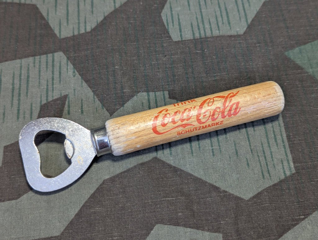 German period Trink Coca Cola advertisingwood handlebottle opener in fairly good condition. A little difficult to date. I believe this to be a pre war example, as it came from behind the former iron curtain and was with other items that dated to the 1930s/1940s. While openers of this type existed before and after the war, they would have only been prevalent in Eastern Germany before the war. Coca Cola was extensively advertised in Germany in the late 1920's - early 1930's; there are plenty of fun photos of Wehrmacht soldiers and even pictures of SA men enjoying a cold Coke on a hot day. Eventually the German branch would split from Coke and rebrand itself as Fanta during the Third Reich period.