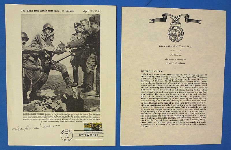Master Sergeant Oresko signed his autograph on a sheet of paper which bears the First Day of Issue cancellation of a U.S. postage stamp commemorating the meeting of American and Soviet troops on the Elbe river in 1945. The sheet is approximately 8-1/2 inches by 11 inches. The sheet is accompanied by a printed copy of Sergeant Oresko's citation for the Medal of Honor. Very good condition.