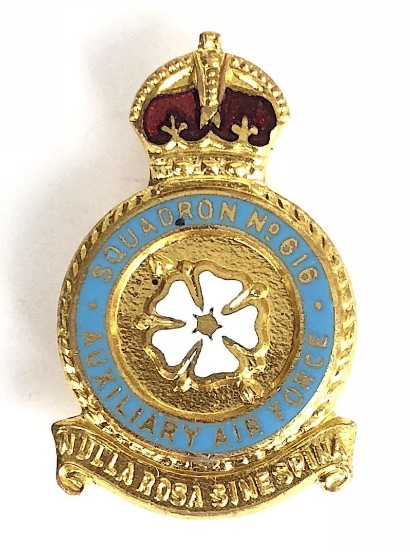 A rare original circa 1940's period 'Royal Air Force Battle of Britain No 616 Auxiliary Air Force gilt and enamel badge' the centre depicting an embossed arrow though a Rose with Latin motto below 'NULLA ROSA SINE SPINA' (No rose without a thorn), the reverse impressed with maker's details 'H.W.Miller Ltd B'Ham 18'. Very good condition, complete with original pin fittings, no damage to the enamel.Height approx 33mm.616 Squadron was formed in 1938 at Doncaster as the last Squadron of the Auxiliary Air Force.