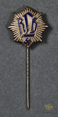 German WWII RLB Starburst Stick Pin-This is the 1ststyle of the iconic RLB emblem. This is an unusual style, as it is a knurled stick pin instead of a pinback. The silver and blue enamel of the RLB script is in very good condition, and nicely toned. This measures 22mm in diameter. It is very nicely marked on the back for the maker H. Aurich with Ges.Gesch. This is a very good example!