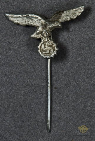WWII German Luftwaffe Heimat und Alarm Flakartillerie (Homeland and Alarm Flak Artillery) Stick Pin-This Luftwaffe eagle is made of zinc that has a silver finish that is 85% in place. This would have been awarded to one of the Heimat und Alarm Flakartillerie civil groups. This group consisted of factory and office employees in industrial areas who were trained to fire anti-aircraft flak fire near their place of work. This stick pin was awarded upon completion of Flak training.This stick pin is in very good condition, and a scarce find.