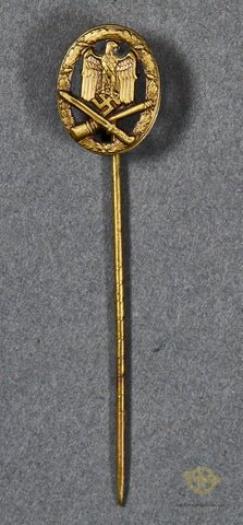 German WWII General Assault Stick Pin-This is a gorgeous example of a mini general assault badge on a knurled stick pin. The details and bronze finish are excellent. The reverse shows some slight spotting, but overall, this is excellent.