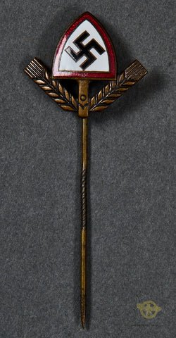 German WWII RAD Stickpin-These are getting very scarce to find. This is the enameled RAD insignia in stick pin form. This is made of bronze and depicts the RAD insignia in red, white and black enamel. The enamel is excellent. This sits on a knurled stickpin. It is nicely marked on the reverse with Ges.Gesch. Overall, excellent and scarce.