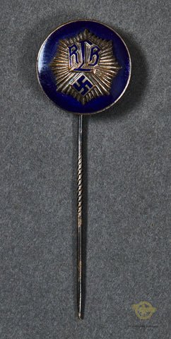 German WWII 2ndModel RLB Stick Pin-This is a very handsome piece! It features a blue enamel disc with the motto of the RLB. This is the 2nd model. The lettering and swastika on the enamel is in very good condition. The reverse of the disc is maker marked G. Brehmer of Markneukirchen, and Ges.Gesch. This is on a knurled stick pin.