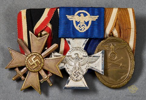 German WWII Three Medal Bar for Police-This bar would look great on your police tunic. This three-medal bar has a War Merit Cross w/Swords, an 18 year police long service award and the final being a West Wall award. The ribbons are all very clean with good colors. The police insignia on the cornflower blue ribbon shows some age, but overall, this is in very good condition. All of the medals themselves are near excellent. They retain the majority of their finish and have excellent detailing. The reverse of this badge is backed with a maroon wool. The long horizontal pin works as it should. This is handsome medal bar in very good condition.