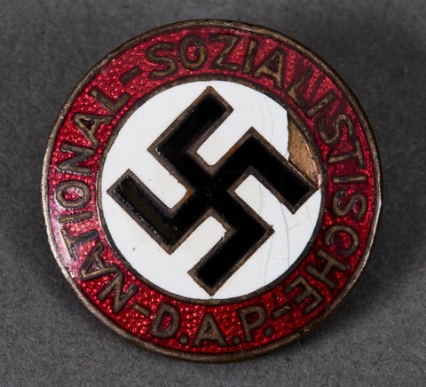 German WWII NSDAP Party Membership Pin- This is a sound example of a party badge. The enamel does have some chips and some enamel loss to the lower half of the badge so please look at the photos. The reverse is marked with an RZM '18'/Ges.Gesch for the maker 18 Gold-und Silber-Scheide-Anstalt, Oberstein a. d. N. A party badge in sound condition.
