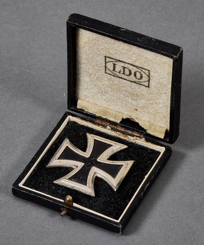 German WWII Cased Screw Back Iron Cross First Class 1939-Scarce offering, as this is a beautiful example marked L55 on the reverse. This was the contract awarded to Rudolf Wächtler & Lange of Mittweida. The black finish is mostly intact on this piece, and the silver frame has a very nice tone. This is a screw back variation. This is nestled in its original black leatherette case of issue which is LDO marked under the lid. The case shows some wear near the inside hinge, and the outside shows the usual bumps and bruises. Overall the case and medal are in very good condition.History: On March 10th, 1813, Prussian King Friedrich Wilhelm III established the Iron Cross as a temporary award for bestowal during times of war. Originally the Iron Cross was introduced in three grades with a Grand Cross intended for award to Senior Commanders for successfully leading troops in combat and the First and Second classes for award to all ranks for bravery or merit in action. The Iron Crosses were reinstituted by King Wilhelm I on July 19th, 1870 for award during the Franco-Prussian War and again on August 5th, 1914, by King Wilhelm II for award during WWI. On September 1ST 1939 Hitler once more reinstituted the Iron Cross series of awards in the First and Second Classes and established the Knight's Cross of the Iron Cross. The first-class medal was for award to personnel who performed three to five acts of bravery in combat and had already been awarded the Iron Cross second class.
