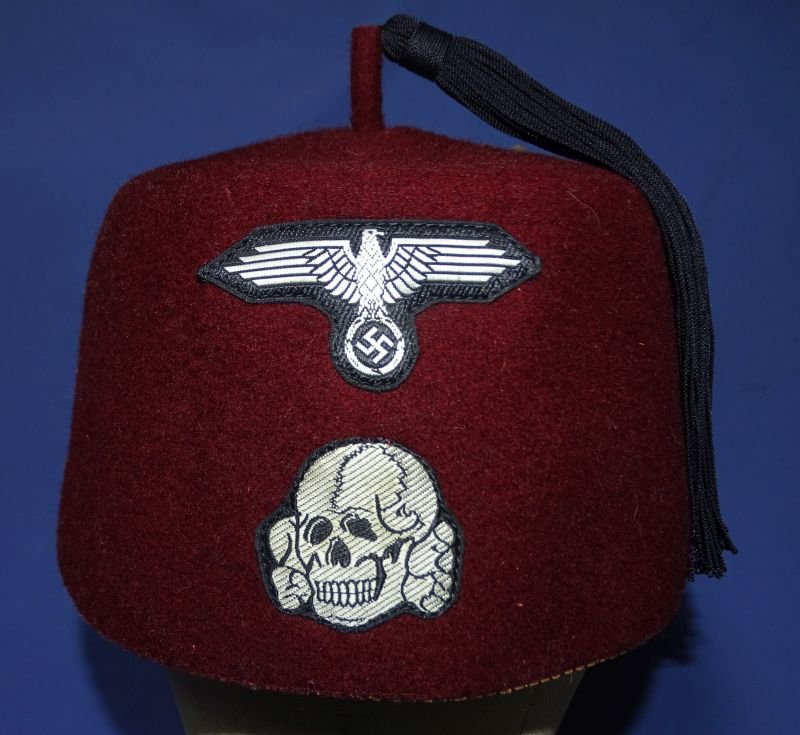 Burgundy fez as worn by Enlisted Men of the Waffen-SS 'Handschar' (13th SS Mountain Division). The Handschar Division was issued two variations of the fez: a field-grey model for combat and duty wear, and this maroon model for parades, marches, and off-duty use. In excellent condition showing minor use only.