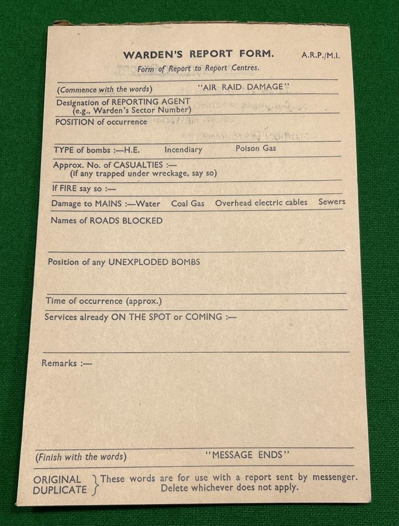 Pad of the standard Warden's report form, A.R.P./M.1. Instructions for use of the form printed to the reverse card support. The 1939 printed forms include sections for air raid damage, type of bombs, casualties, uxbs etc. Overstamped to the reverse to provide for a supplementary report. Good, clean condition with approx.30 forms remaining.