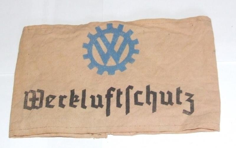 A cloth armband for the Volkswagen Luftschutz air defence organisation protecting VW factories around Wolfsburg. Blue VW insignia and the words Werk Luftschutz on a discoloured white cloth armband. Reichluftschutz stamp on the reverse.