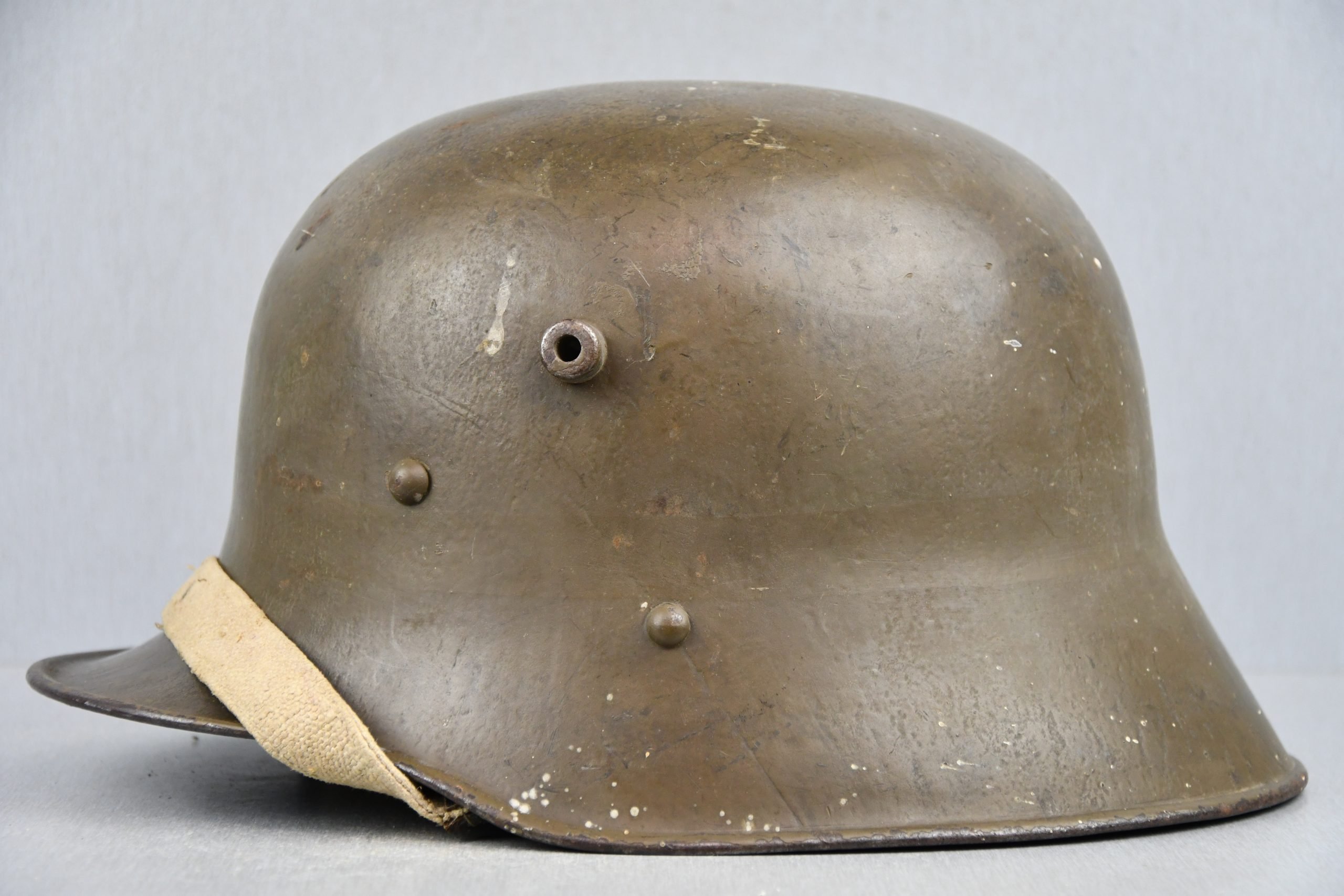 Standard issue M17 Austrian WW1 steel helmet. Remains in light worn condition. Complete with often missing original liner and chin strap.