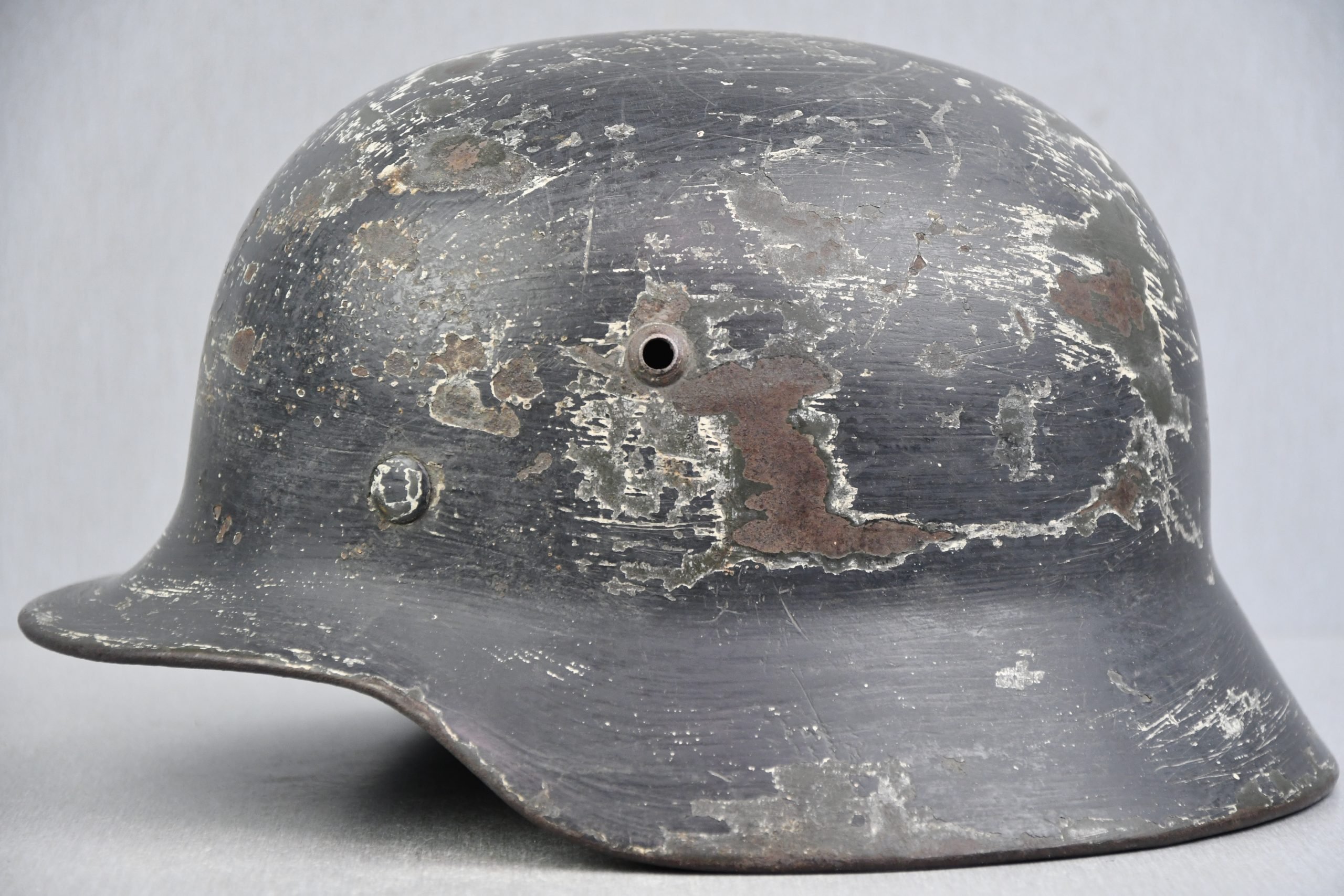 Well worn M35 steel helmet. Started as a M35 double decal army example, in apple green color. Was overpainted in rough field green paint per 1940 regulations, covering (at least one) the decals. The inside rim was also painted in this similar sand mixed rough paint, even leaving traces on the aluminum liner band, so you know the liner never left the helmet! Afterwards the helmet was painted in white for a winter offensive. After the offensive, it was painted grey again. Than you add some more combat and wear, and this is how the helmet looks today. The dome of the helmet, under the liner, still shows the basic apple green color. Inside shows the original liner, size marked 54, dated 1938. Leather remains supple and strong. Draw string is a shoe string. Shell markings not visible due to the thick paint, but most likely a ET62 helmet. Nicely named to Unteroffizier 'Uffz.' Trautmann.