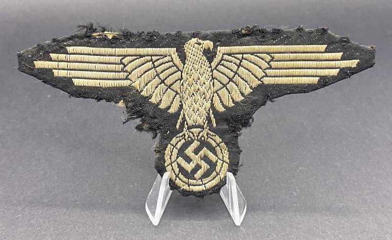 Nice original uniform removed Waffen SS enlisted man's Bevo sleeve eagle as worn by late war troops. Front of the eagle in very good shape. Many original threads present including the original stitch holes. Some paper on the back, likely where it had once been in an album. A very nice clean eagle. Clearly field used and difficult to find compared to embroidered examples!