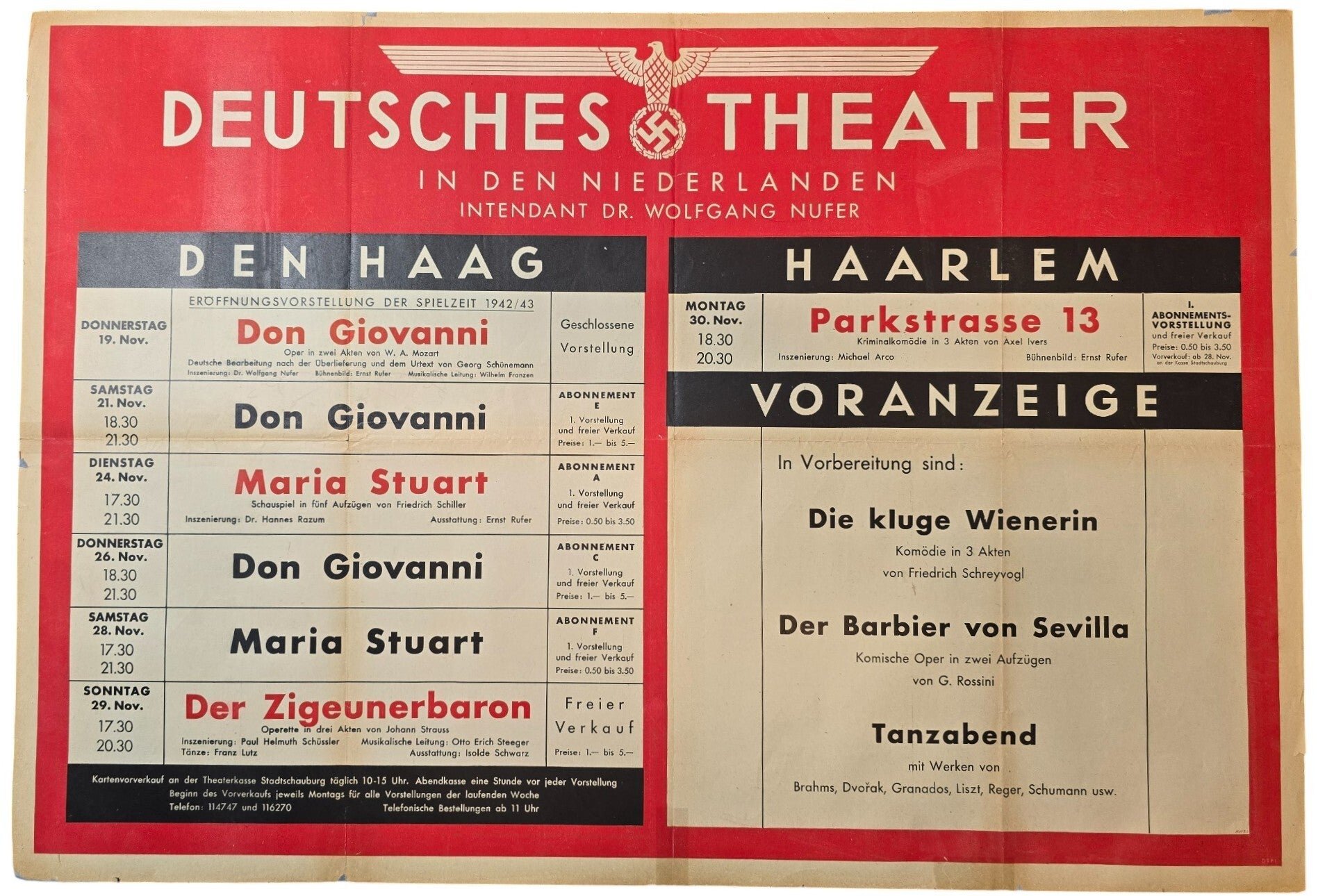 Original WW2 Dutch German Poster - Deutsches Theater in den Niederlanden movie poster, Den Haag, Haarlem (1942)Approximately 80 x 55 cmRepaired with acid-free tape.Don Giovanni, Maria Stuart, Der Zigeunerbaron, Parkstrasse 13, Die Kluge Wienerin, Der Barbier von Sevilla, Tanzabend.Originele Wo2 Nederlandse Poster - Deutsches Theater in den Niederlanden film poster, Den Haag, Haarlem (1942)Ongeveer 80 x 55 cmGerepareerd met zuurvrij tape.