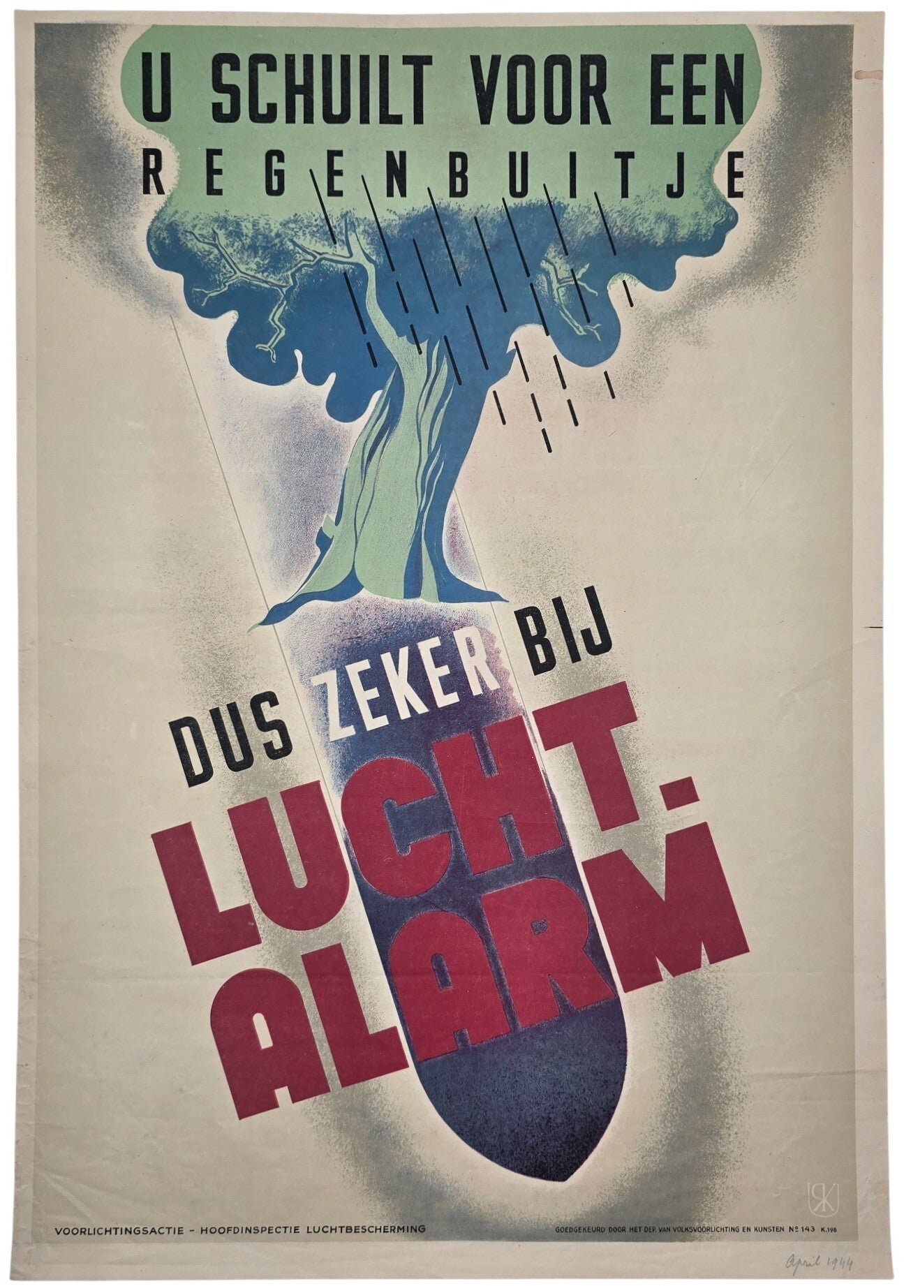 Original WW2 Dutch LBD Poster - U schuilt voor een regenbuitje, dus zeker bij Luchtalarm (1944)Approximately 38 x 55 cmLuchtbeschermingsdienstOriginele Wo2 Nederlandse Poster - U schuilt voor een regenbuitje, dus zeker bij Luchtalarm (1944)Ongeveer 38 x 55 cmLuchtbeschermingsdienst