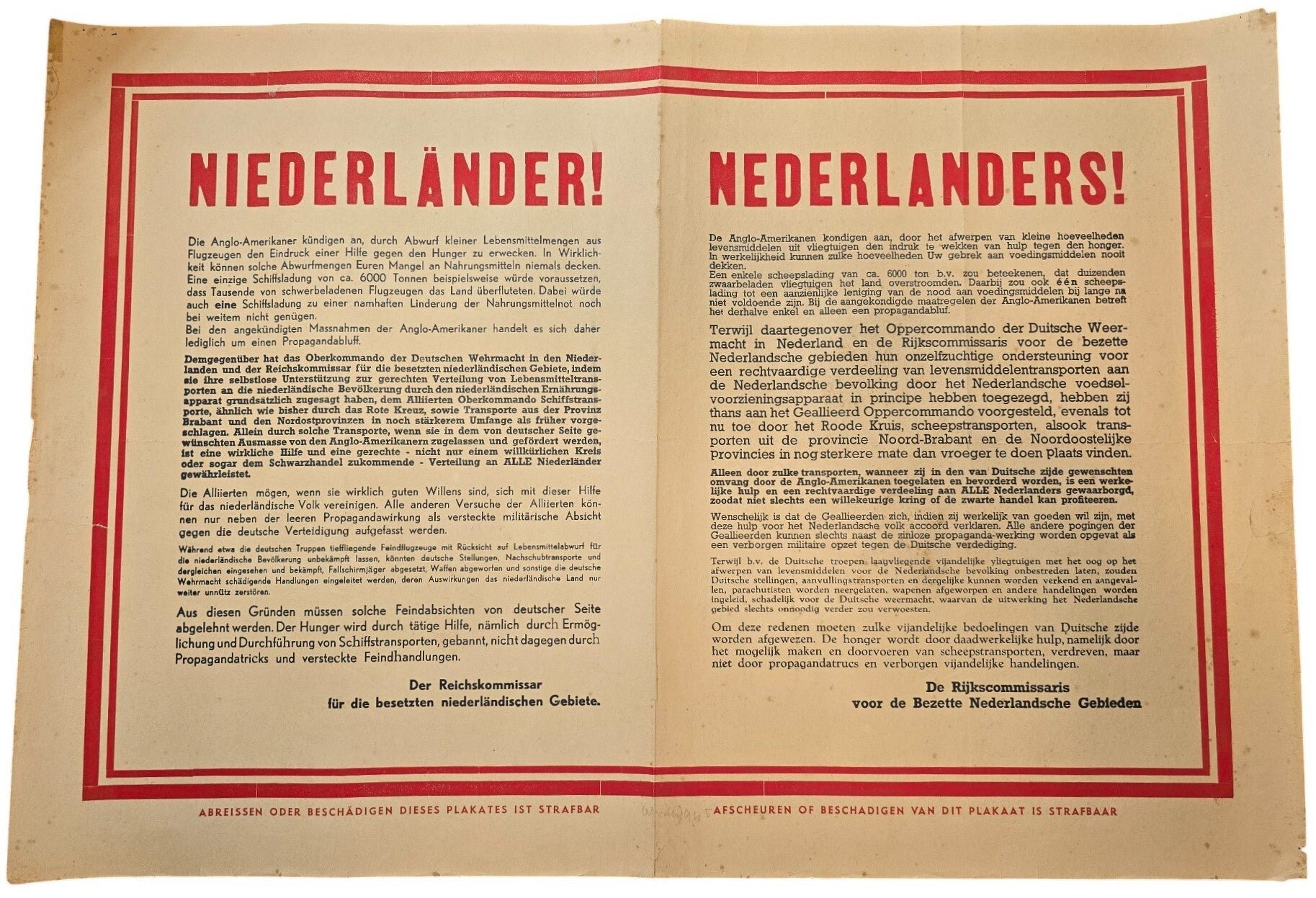 Original WW2 Dutch German Poster - Nederlanders! Food-droppings by airplane, Seyss-Inquart (1945)Repaired with acid-free tape. German reaction by Arthur Seyss-Inquart about the Allied food distribution to the Netherlands by airplane. They called it a propaganda stunt.Approximately 80 x 55 cmOriginele Wo2 Nederlands Duitse Poster - Nederlanders! Voedseldroppings per vliegtuig (1945)Gerepareerd met zuurvrije tape. Duitse reactie van Arthur Seyss-Inquart op de geallieerde voedseldistributie naar Nederland per vliegtuig. Ze noemden het een propagandastunt.Ongeveer 80 x 55 cm