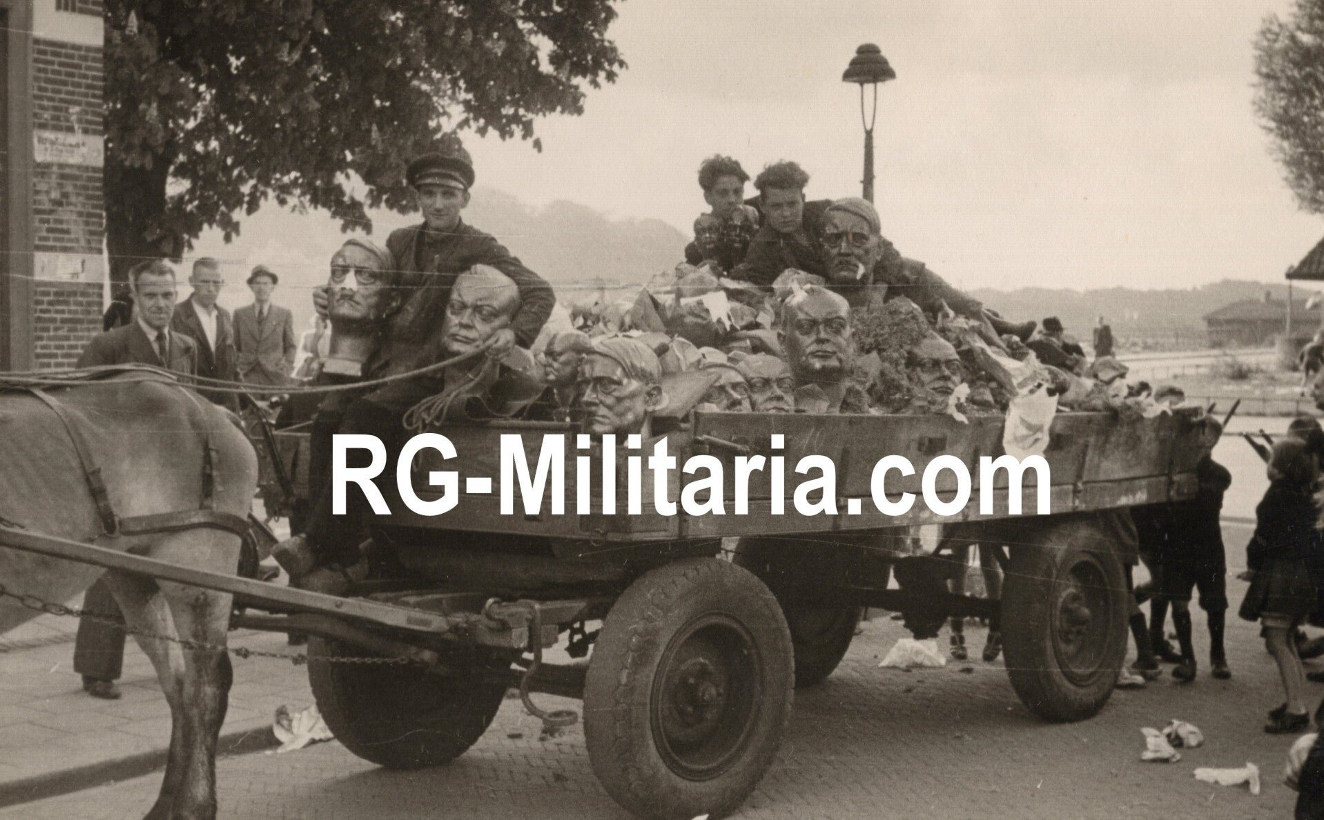 Original WW2 Dutch Liberation Photo - Horse cart full of Adolf Hitler and Anton Mussert bronze / plaster heads during the liberation of Amersfoort, Holland (1945)