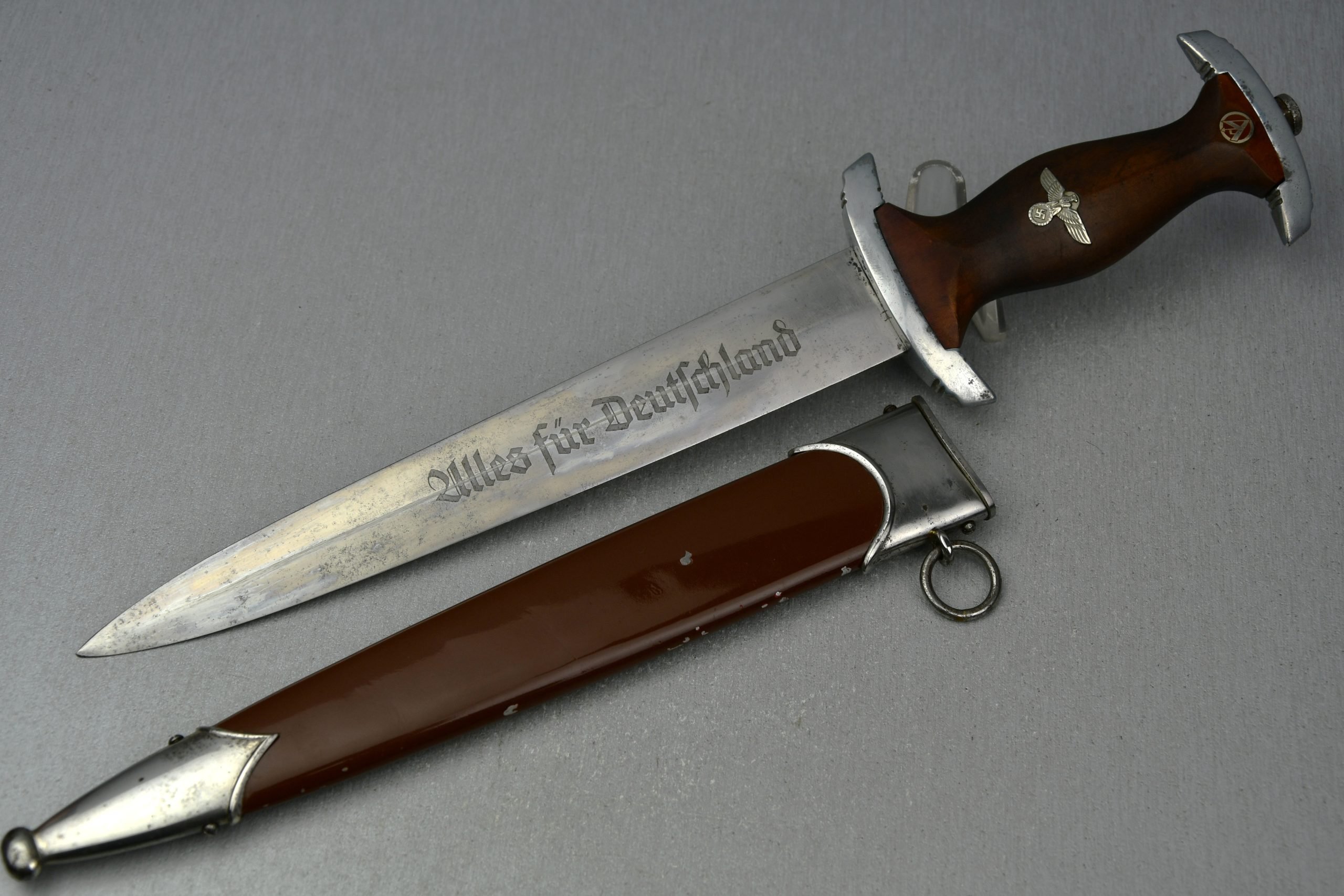 Standard issue M33 SA dagger. Wooden grips with detailed eagle and SA mark. Genuine brown scabbard in its original coating. The blade remains in good condition and shows the motto: Alles für Deutschland! Maker marked by RZM M7/12 (WMW, Waffenfabrik Max Weyersberg Solingen).SHIPPING ONLY IN MAINLAND EUROPE!
