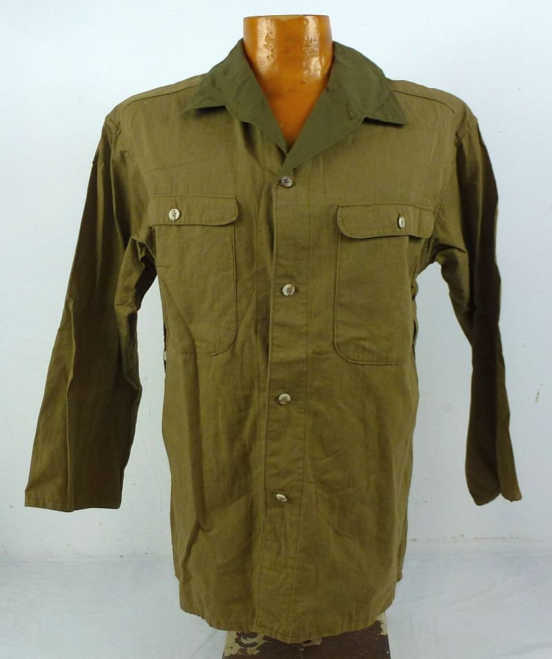 The olive green cotton tropical officer shirt is in excellent condition, without holes or damage. Each side has a ventilation opening. All buttons are present and intact.