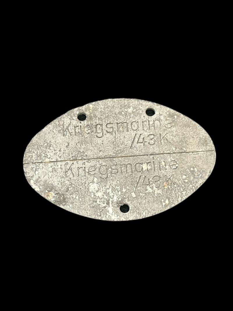 This is a WW2 German Kriegsmarine dog tag with the stamping 43/K and on the other side Marinehelfer 10189.Check out our YouTube channel below.https://m.youtube.com/results?sp=mAEA&search_query=chase+militaria+