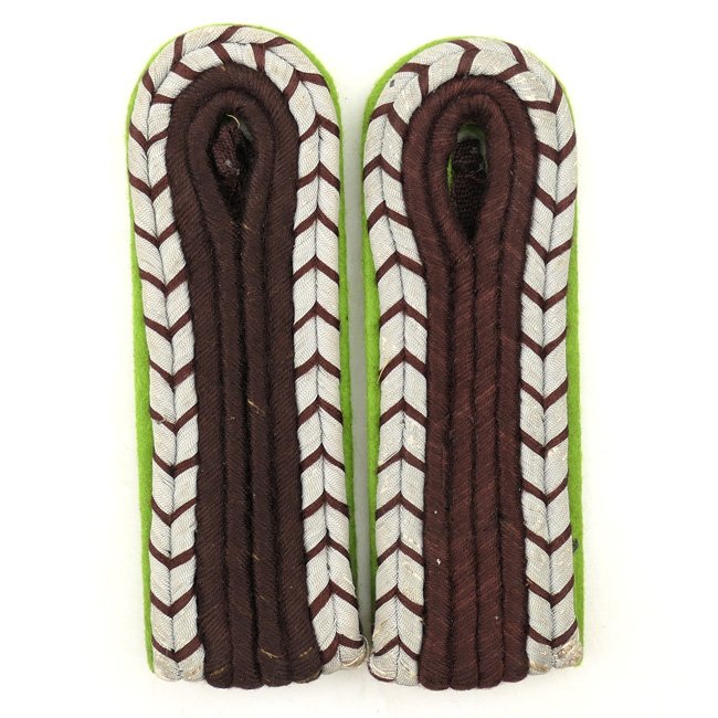 Pair of 'Schutzpolizei' shoulder-boards. The police were divided into eight assorted branches of service and during the restructuring the different police agencies were assigned specific identifying 'Truppenfarbe' (Branch Colors), with the green truppenfarbe being allocated to the 'Schutzpolizei des Reichs' (National Protection Police). The German Police had no enlisted ranks with the lowest rank being an 'Unterwachtmeister' which was equivalent to the German army rank of Unteroffizier. This is a pair of 'Schutzpolizei' shoulder-boards as intended for a 'Wachtmeister der Schutzpolizei'. The boards are constructed from dark brown and silver braid on a green underlay. The boards are complete with slip-on tongues. Nice original shoulder boards in very good condition!