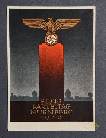 German WWII Party Propaganda Postcard-This is a postcard from the 1936 Nurnberg Reichsparteitag rally that was held annually in Nuremberg Germany from 1933 until 1938. These rallies were held to showcase the power of the party and to reinforce party enthusiasm. This 1936 rally focused on the evils of bolshevism, and Germany's needs for raw materials and demands for the return of former colonies. Of course there were speeches by Hitler, parades and armed forces marches. There is an address and note. This has a gorgeous red stamp, as well as an interesting cancellation stamp. This postcard measures approx. 5 ¾ inches (14.60cm) long, by 4 inches (10.16cm) wide.This postcard is in very good condition with bright colors.