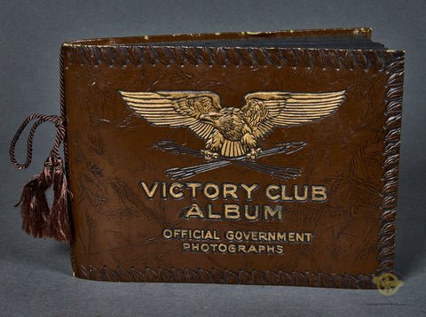 US WWII Photo Album-This is bound in brown leatherette with a fancy gold eagle and lettering that reads 'Victory Club Album, Official Government Photos'. It measures 9 ΒΎ' by 7 ΒΌ' and is string bound. There are 52 pages with 83 photos/post cards inside. A few are not mounted. The album was the property of Pvt. William E Meier, Co. B, 29thBattalion, M.R.C., Camp Grant, IL. This was a medic training facility located in Rockford, IL. There are lots of photos of basic training, vehicles and family. There are also photos related to Texas and Kansas. A lot of these have notations on the reverse. This is a very cool item!