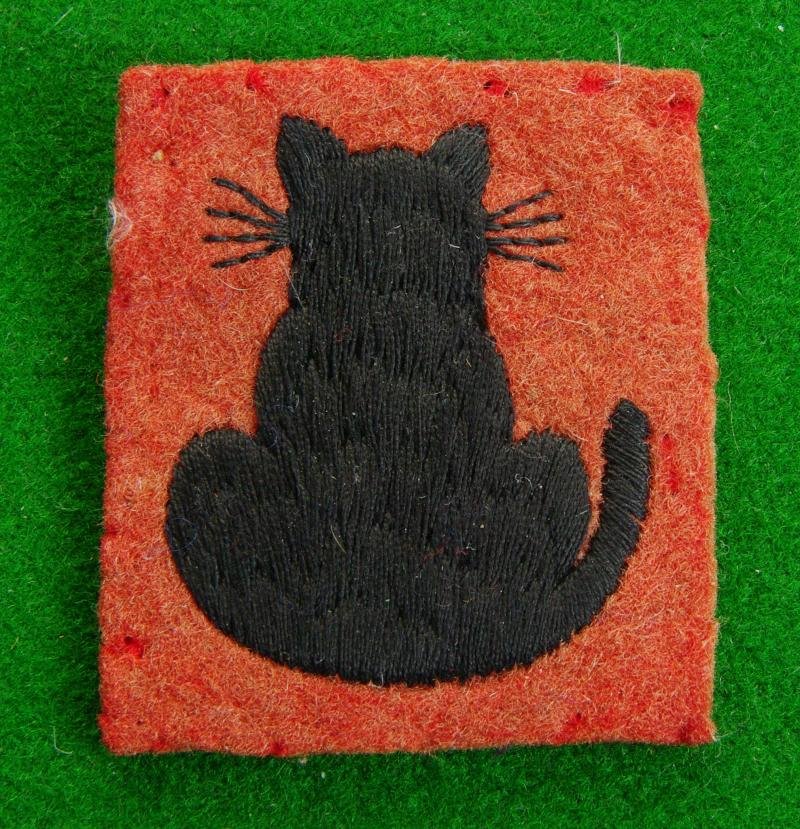 WW embroidered example of the black cat {Dick Wittington's Cat} on a red background. This division fought in the Middle-East before taking part in the landings at Salerno and Anzio for the fierce fighting all the way up through Italy.