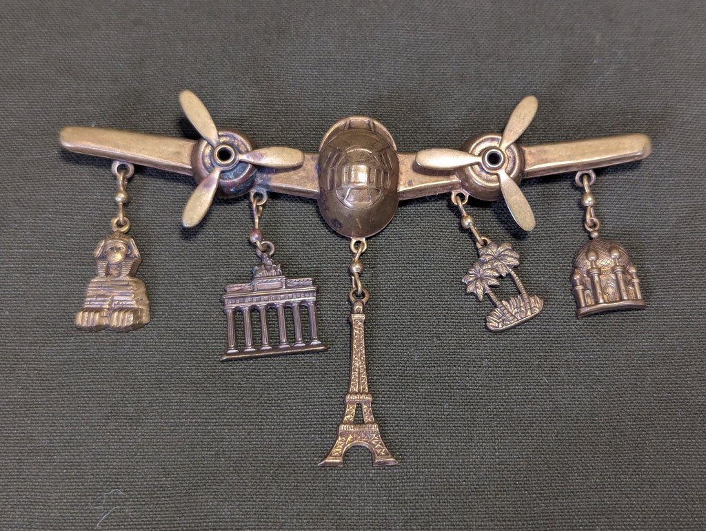 Original plane pin with charms. The airplane looks like a B-25 Mitchell bomber (or maybe a Douglas A-20) which was active in all theaters of the war. It has charms from various places the army was - including Berlin! Sphinx for the Africa campaign, Brandenburg Gate for Berlin, Eifel Tower for Paris, palm trees for the Island campaigns and the Taj Mahal for the CBI theater. Decent condition with some wear and discoloration.