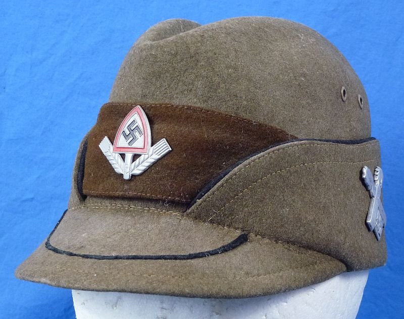 The wool cap shows some surface tracking and spots from wear and use, but it is without holes or damage and the cap has a fine appearance. The left side of the cap bears the traditions badge of RAD Arbeitsgau XVIII, The interior of the cap retains its leather sweatband, which has a few splits. The interior of the crown is marked as a size 58 and it is dated '9 34'. The interior also has the stamp of RAD Abteilung 21287, as well as the stamp of Gau XXVIII. Overall the cap is in very good condition.