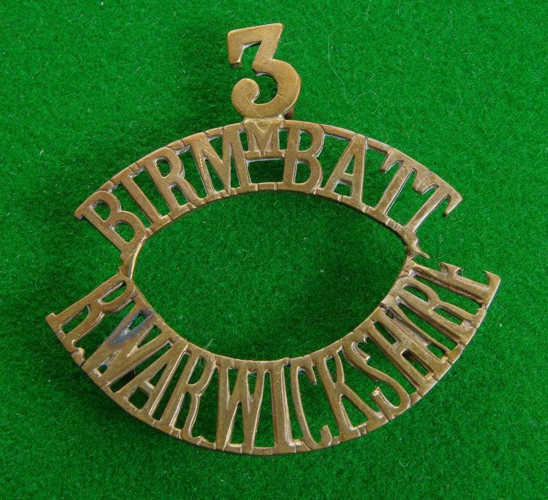 Scarce brass shoulder title, ' 3 / Birm m Batt. / R.Warwickshire.' Worn by the WW I raised Kitchener's Army ' 3rd. Birmingham {16th.Service} Battalion Royal Warwickshire Regiment '.