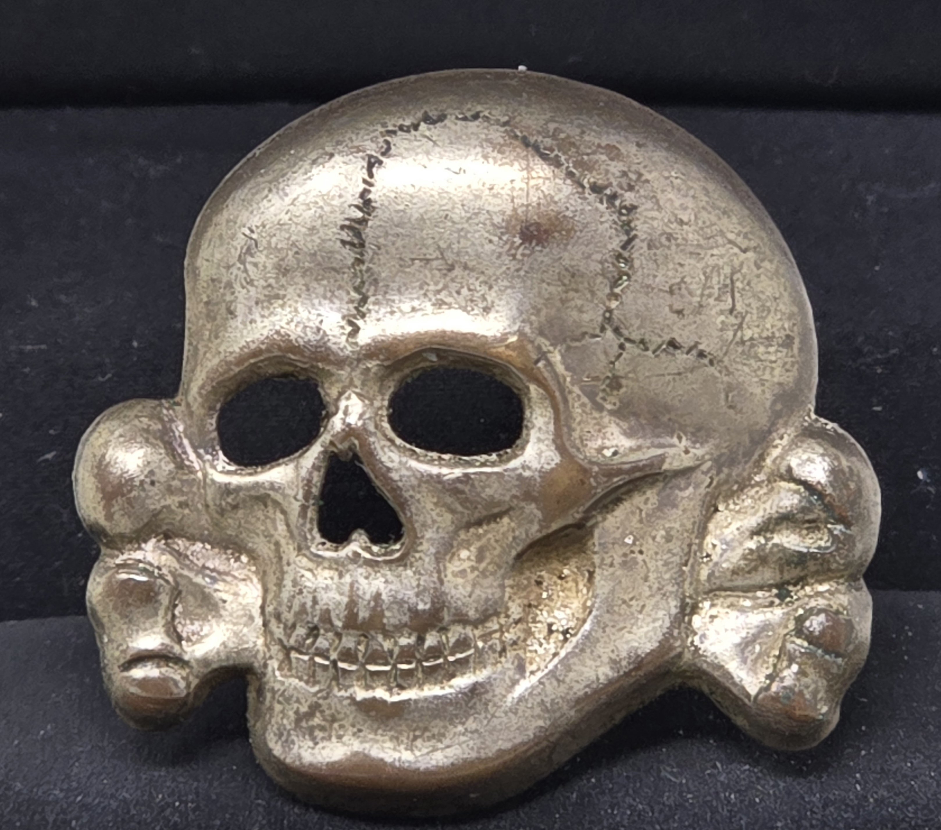 This is a superb tombak Deschler skull, M1/52 marked, prongs fully intact and strong, beautiful finish. It shows a great patina, and is untouched. A fine piece, great for the collection. COA accompanies.
